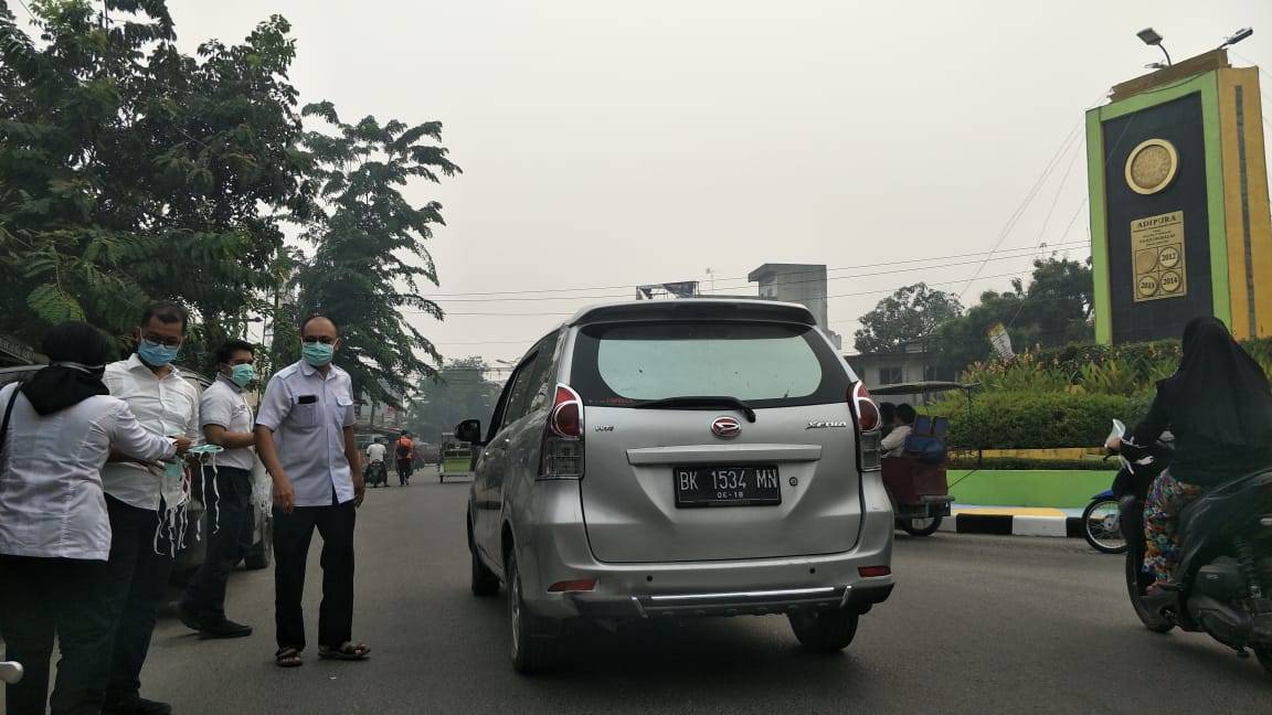 Tanjungbalai, Dinas Kesehatan Kota Tanjungbalai, Sumatera Utara bagi masker kepada pengendara di jalan Jendral Sudirman akibat kepulan asap kiriman dari Riau, pada Rabu (18/9/2019).