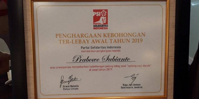 Partai Solidaritas Indonesia (PSI) memberi penghargaan kebohongan kepada pasangan calon presiden dan wakil presiden nomor urut 02, Prabowo Subianto-Sandiaga Uno, Jumat (4/1/2019). Selain itu, penghargaan kebohongan juga diberikan kepada Wakil Sekjen Partai Demokrat Andi Arief. (Foto:Kompas/Ihsanuddin)