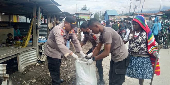 Peduli Kebersihan, Personil Polres Deiyai Gotong Royong Bersama Mama-Mama Pasar