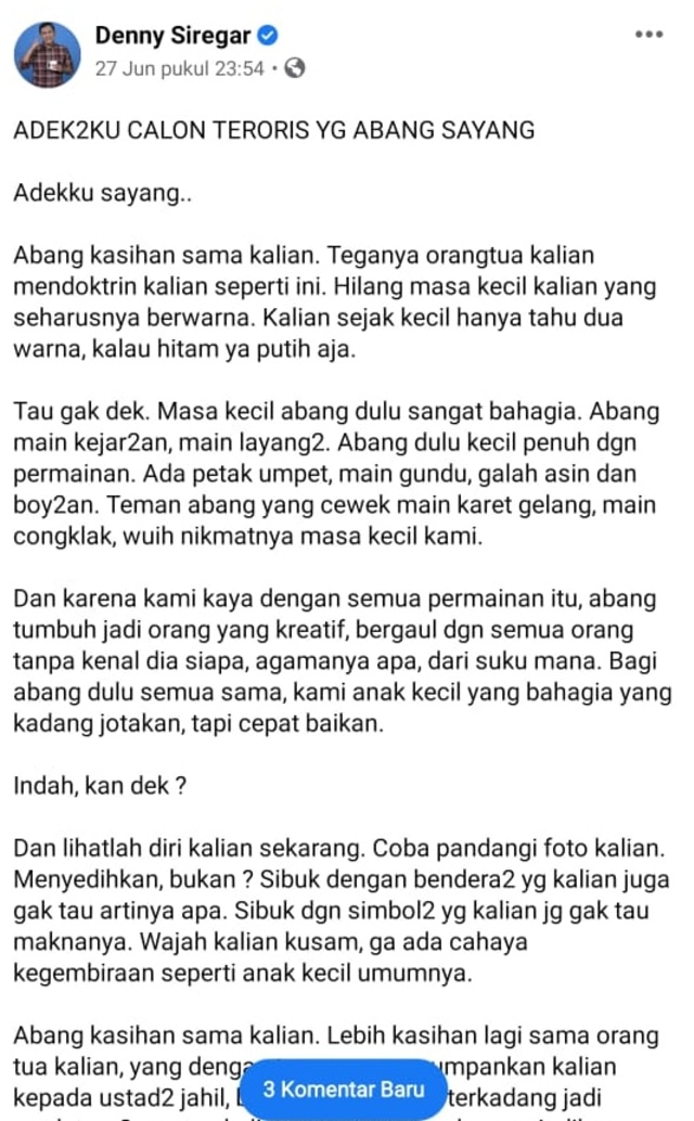 Lalu, tambahnya, isi stigmatisasinya salah pula. Dan bahkan, dengan isi stigmatisasi yang salah tersebut, Denny Siregar sebagai penulis abai terhadap apa yang semestinya dilakukan negara pada anak-anak seperti diasumsikan dalam tulisannya. “Negara hadir untuk semua anak tanpa pengecualian, bukan?” tandas Reza.