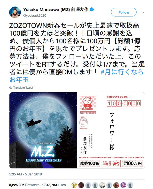 Unggahan tersebut sekaligus dalam rangka perayaan penjualan Zozotown mencapai 10 miliar yen selama periode Natal dan Tahun Baru. “Untuk berpartisipasi, kalian semua harus mengikuti saya dan RT tweet ini,” katanya dilansir BBC.
