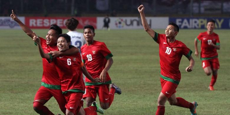 Pemain Indonesia berselebrasi setelah membobol gawang Korea Selatan pada pertandingan kualifikasi Piala Asia U-19 di Stadion Utama Gelora Bung Karno, Jakarta, Sabtu(12/10/2013). Indonesia lolos ke putaran final Piala Asia U-19 yang akan berlangsung di Myanmar tahun depan, setelah menang dengan skor 3-2.
